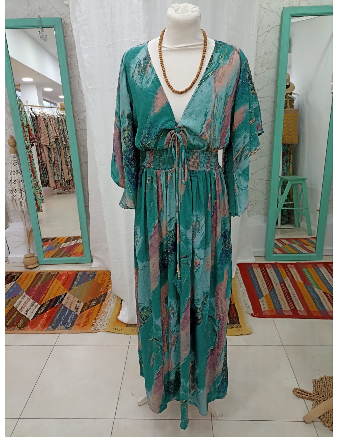 Vestido largo con mangas estampado turquesa rosa